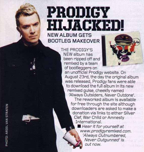 The same day that XL Recordings released The Prodigy's eagerly anticipated album, 'Always Outnumbered, Never Outgunned', an underground collective of remix and mash-up artists released 'Always Outsiders, Never Outdone', a free download album featuring remixes of every track from the original. (Those downloading the album were encouraged to make a donation to War Child, Amnesty International and/or Nordoff Robbins Music Therapy.)